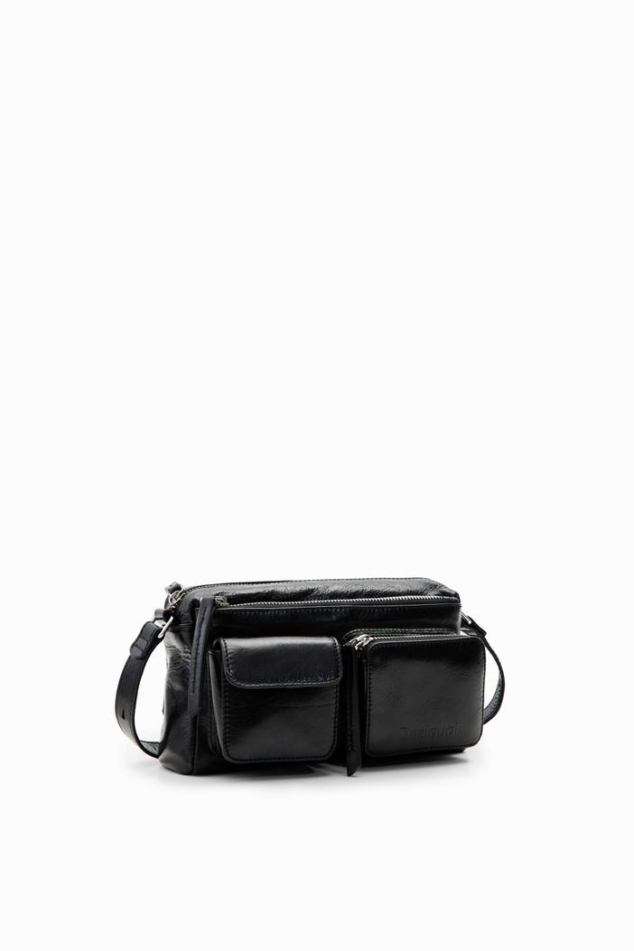 A small leather crossbody bag with several different-sized inside and outside pockets.