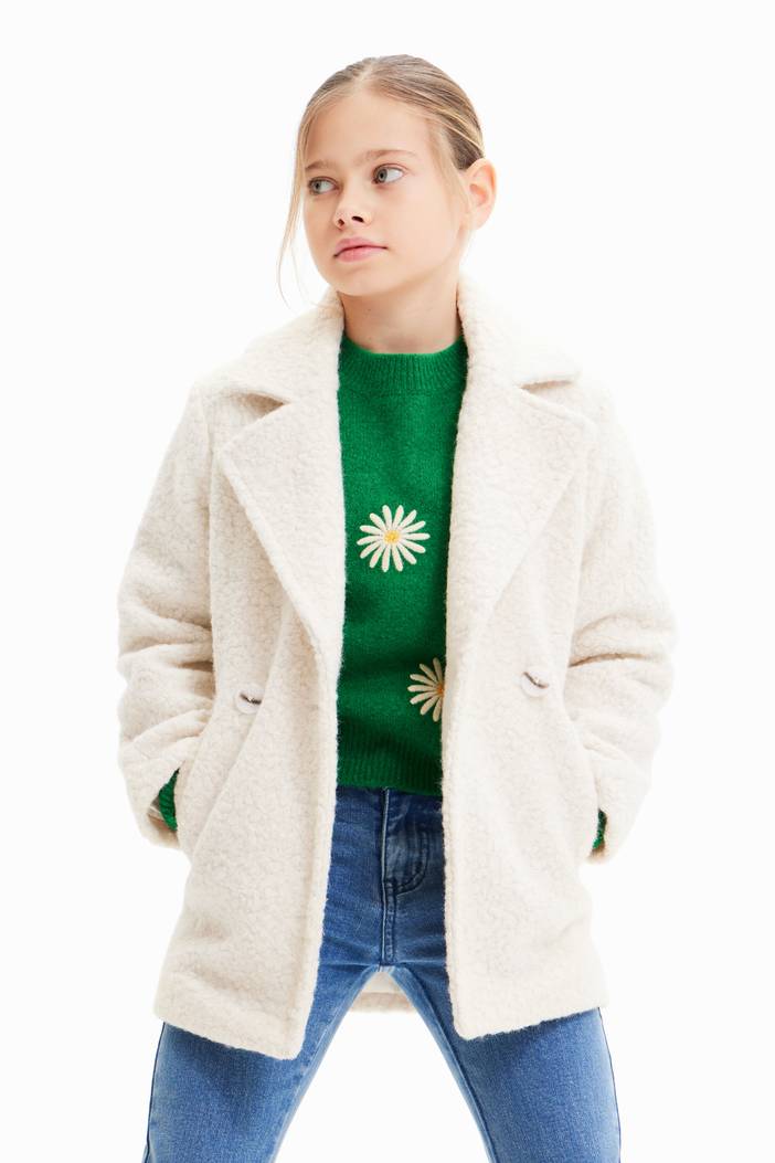 A double-breasted coat in bouclé-effect fabric with inner lining, lapels and pockets.