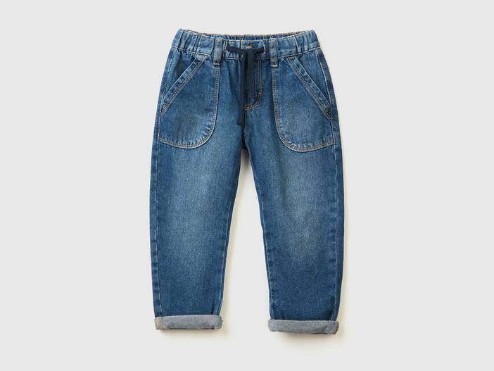 Lange Hose aus Denim in reiner Baumwolle mit leichtem Used-Effekt. Bund mit Gummi innen an der Rückseite und Tunnelzug sowie praktische Öffnung mit Reißverschluss und Knopf. Praktische, vorne aufgesetzte Maxi-Taschen und kleine Taschen hinten. Ein Modell mit angenehmer Passform, das auch mit Saumaufschlag getragen werden kann.