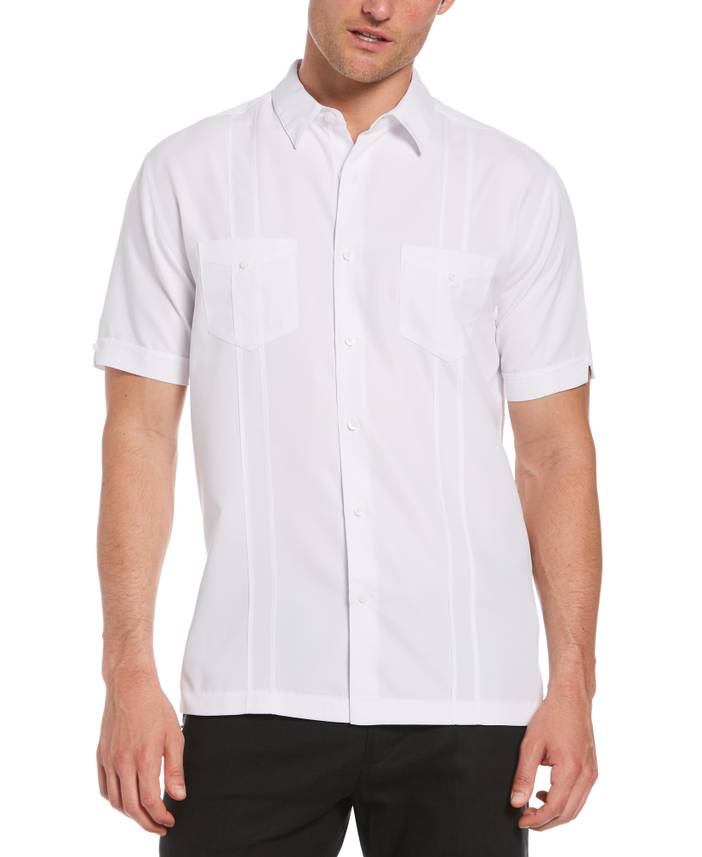 Bring the Latin heat in our guayabera-inspired short sleeve shirt. Featuring two chest pockets, cuffed sleeves, and double pintucks, this shirt has all the details to go from casual to formal. Pair it with linen pants or cargo shorts and make it your own. 100% Polyester Classic Fit Plain Weave Fabrication Weaves In Criss-Cross Patterning For Extra Durability Easy Care Soft Touch Plain Weave Fabrication For Durability Soft Touch, Sandwashed Fabric For Added Comfort Point Collar For A Polished Look Double Pintucks And Two Chest Pockets For Guayabera-Inspired Style Short Cuffed Sleeves Short Sleeve Machine Wash Imported | Cubavera Men's Two Pocket Double Pintuck Short Sleeve Shirt in Brilliant White, Size Large, 100% Polyester