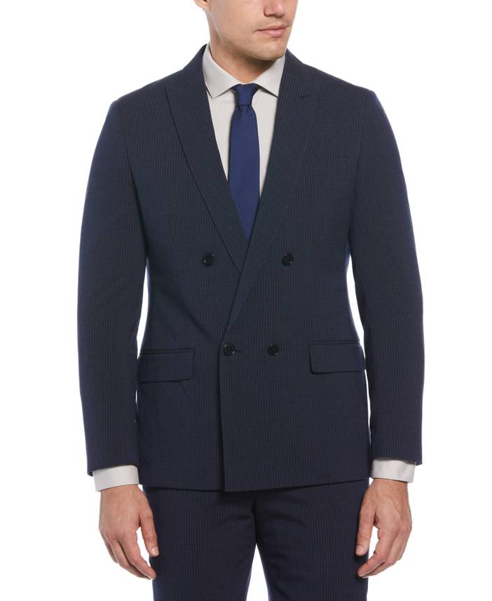 70% Polyester / 20% Rayon / 10% Spandex Lining- 100% Polyester Slim Fit Dry Clean Only Stretch Peak Lapel Two Button Closure Natural Shoulder Long Sleeve Pair WithSlim Fit Pinstripe Suit Pant Imported Model Measurements: Height: 6'1" Waist: 32" Wearing Size40 Reg | Perry Ellis Men's Slim Fit Double Breasted Pinstripe Suit Jacket in Navy/Blue, Size 42 | Regular, Polyester/Rayon/Spandex