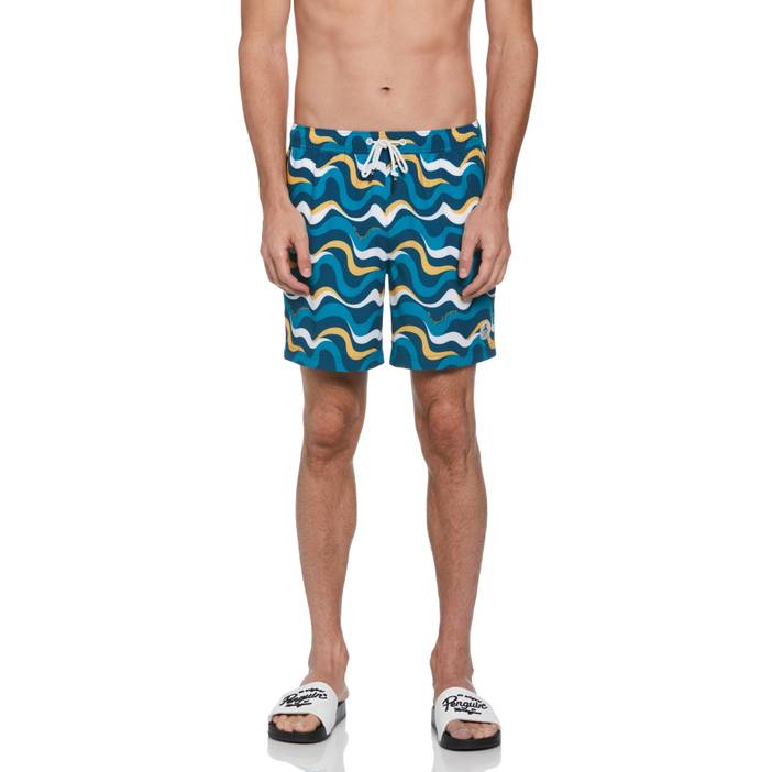 These eco-friendly men's swim shorts from Original Penguin are designed to combine style and sustainability in one sleek package. Crafted from 55% recycled polyester sourced from plastic bottles, these swimming trunks are the perfect beach companion for eco-conscious swimmers. Lightweight twill fabrication ensures a comfortable fit, while the stylish wave print guarantees you'll make a splash at the pool or beach. Embrace the perfect balance of fashion and function with these men's swim trunks, expertly tailored to suit your swimwear needs. Dive into a greener future with Original Penguin's sustainable men's swimwear. 55% Recycled Polyester / 45% Polyester Slim Fit Twill Fabrication Is Lightweight For Coolness And Comfort Lightweight Twill Fabrication Drawstring Elasticized Waist For A Customized Fit Wave Print For Eye-Catching Style Machine Wash Imported Model Measurements: Height 6'2â Waist 32" Modeled in size M | Original Penguin Men's Wave Print Swim Shorts in Cool Blue, Size XL, Recycled Polyester/Polyester | Munsingwear