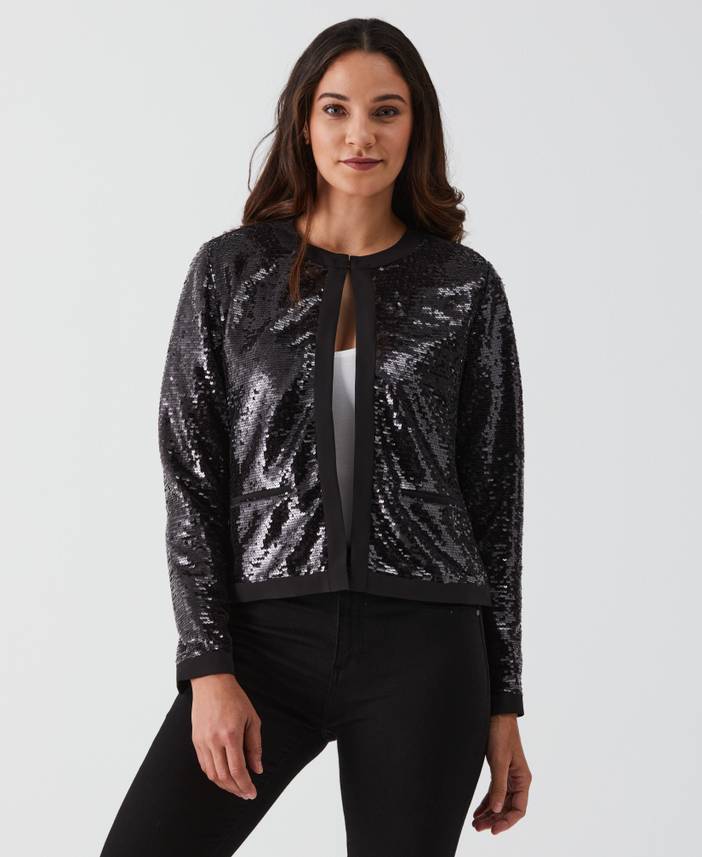 Add a touch of glamour to your wardrobe with this Ella Rafaella sequin jacket. Designed with a secure hook - and - eye closure, this sparkly jacket is a stunning addition to any outfit. It features non - functional welt front pockets and has a fully lined interior for comfort. The sequin embellished fabric shimmers beautifully, making this waist - length womenâs sequin jacket a true statement piece. Pair it with the Sequin Midi Skirt.Pair it with the Sequin Tank Top. 80% Polyester / 20% Nylon Sequin Fabrication Adds Glamorous Style Modern Fit With 23.5" Waist Length Non - Functional Front Pockets Fully Lined For Comfort Hook - And - Eye Closure Long Sleeves Hand Wash Imported | Ella by Rafaella Women's Sequin Jacket in Shark Gray, Size XL, Solid, Polyester/Nylon