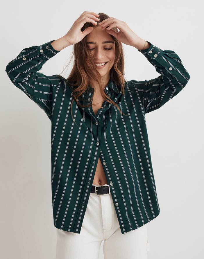 An oversized version of our favorite tomboy button-down with a cool slit shirttail hem. It has an easy shape fashioned in shiny satin woven with eco-friendly TENCEL™ lyocell fibers.Regular fit.Hip length: designed to hit at high hip or below; tuckable.Body length from high point of shoulder: 28 3/8".70% viscose/30% TENCEL™ lyocell.Do Well: Eco-friendly TENCEL™ lyocell fibers are derived from sustainable wood sources (meaning notancient or endangered) in a closed-loop process.Machine wash.Imported.