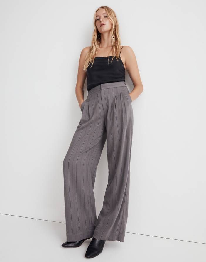 Coming in pinstriped drapey twill, this low-slung version of our best-selling pant has front pleats, a wide leg, adjustable button tabs at the back and can be worn high at the waist. Try it with the matching blazer for a coordinated look.10 3/4" rise, 22" leg opening, 30" inseam.Viscose/acrylic/elastane.Do Well: for each piece made at the Fair Trade Certified™ factory, we contribute to a Community Development Fund managed by the workers.Machine wash.Imported.Madewell.com only.