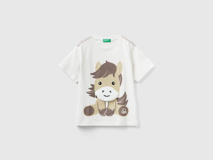 Kurzärmeliges Shirt mit Rundhalsausschnitt aus reiner Baumwolle. Maxi Pferde-Print auf der Vorderseite, auf der Schnauze appliziertes kleines Etui mit Reißverschluss. Als Detail kontrastierende Steppnaht auf den Schultern. Fröhlich für alle Tage.