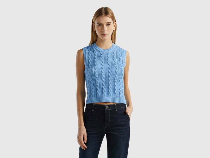 Benetton, Cropped Pullunder Mit Zopfmuster, größe L, Hellblau, female