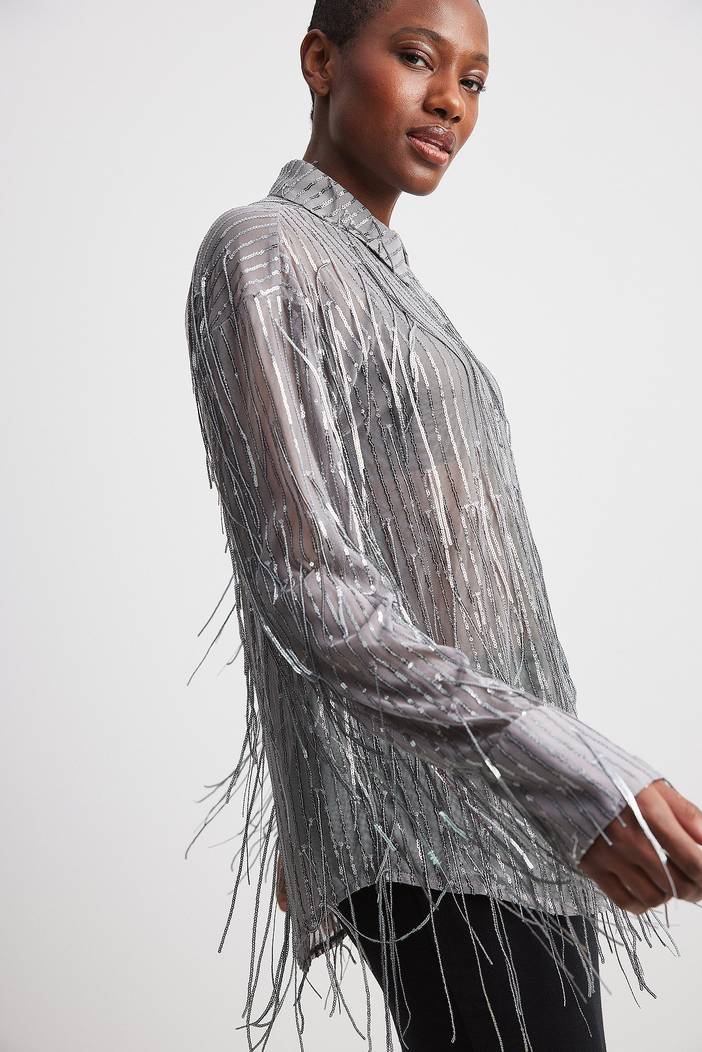 Dit hemd heeft een ontspannen oversized pasvorm en een doorzichtbaar materiaal met franjedetails van lovertje. Het heeft een klassieke kraag en manchetten met dubbele knoop. Onze hemd heeft een sluitknoop langs de voorzijde.
