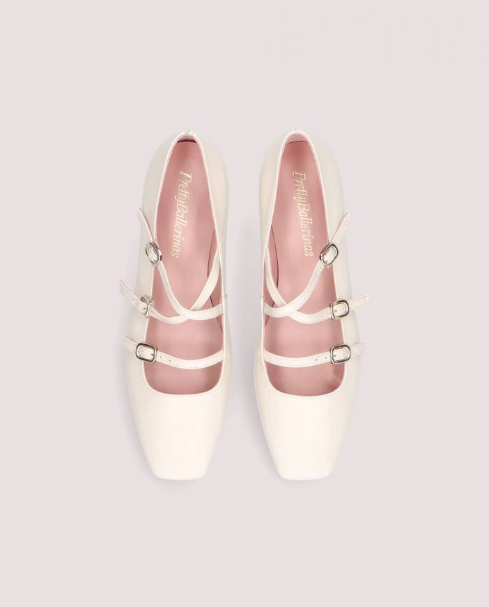 Ballerina Camille with a square toe in ivory patent leather with triple strap detail, rubber sole, leather insole and lining.