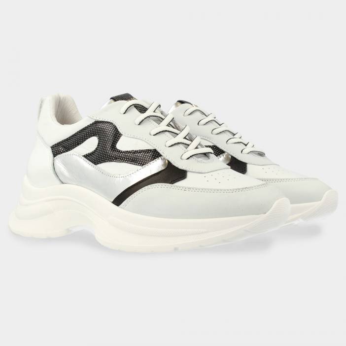 Stoere runners zijn ook dit voorjaar onmisbaar in elke garderobe. Dit zilveren model past bij elke outfit. Ze zijn gemaakt van hoogwaardig leer en hebben een leren binnenvoering.
