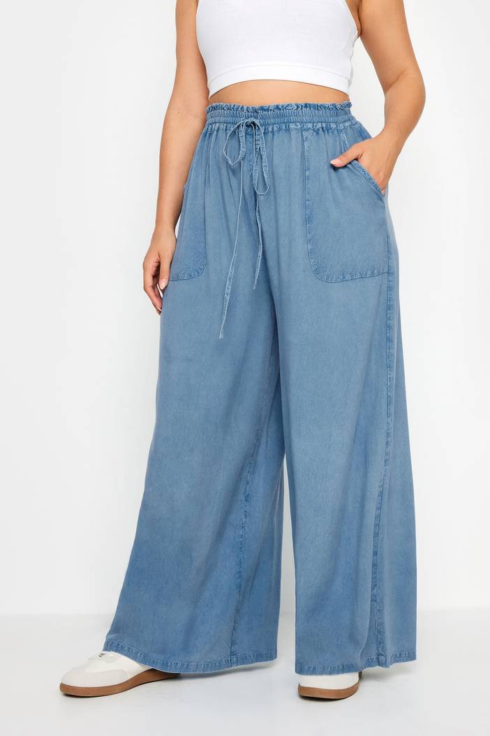 Chambray Broek Met Wijde Pijpen En Elastische Taille In Lichtblauw, Dames Curve & Grote Maten Kleding, Yours