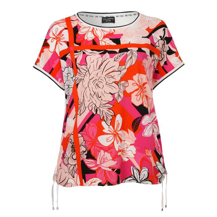 VIA APPIA DUE bringt mit diesem Blusenshirt Blumen in Ihren Kleiderschrank! Es begeistert jedoch nicht nur mit seinem grafischen, floralen Front-Print. Durch die unifarbene Rückseite entsteht ein spannender Kontrast zur Aufsehen erregend gestalteten Vorderseite und die kurzen Ärmel mit Rippbündchen strahlen sommerliche Leichtigkeit aus. Der gerade Schnitt mit seitlich gerafftem Bund schafft zudem eine bequeme Passform, die zusammen mit der hautfreundlichen Viskose optimalen Tragekomfort bietet.