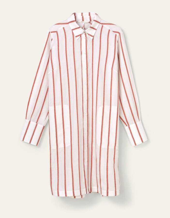 Een kleurrijke, gestreepte tuniek jurk met 2 verstopte zakken. Het is onze interpretatie op het mannenoverhemd maar dan voor echte vrouwen met lef. De wat langere manchetten zorgen voor een mooie slanke elegante look. De jurk heeft een boxy fit. Anastasia (179 cm) draagt: EU 36 / UK 8 / US 6 / Small