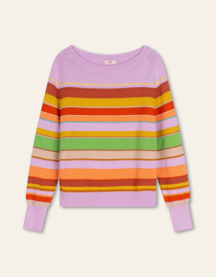 Een echte lentrui van organisch katoen met verschillende strepen in verschillende steken waardoor het een ambachtelijke look krijgt. Valt mooi op de tailleband van je broek of rok. - 100% GOTS Certified Organic Cotton Yarn - Regular fit - Gemaakt in Roemenië