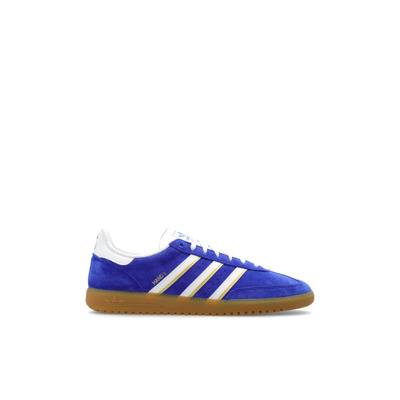 Blauwe en witte Hand 2 sneakers van Adidas Originals. Gemaakt van suède en leer, dit veterschoenmodel rust op een bruine rubberen zool en toont het logo van het merk en de kenmerkende drie strepen in wit en goudkleurig aan de zijkanten. Zoolhoogte: 2 cm Zoolhoogte op het hoogste punt: 3 cm