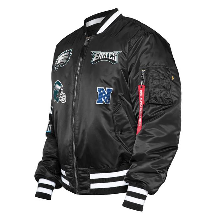Alpha Industries Philadelphia Eagles Reversible Bomber Jacket Philadelphia Eagles logo on right chest Philadelphia Eagles helmet logo on right chest Eagles wordmark on left chest NFC logo on left chest Philadelphia Eagles logo on rear Phi wordmark on right sleeve Super Bowl LIII patch on right sleeve Multi compartment pocket with Alpha Industries zip tab on left sleeve Philadelphia Eagles logo on inside left chest New Era label graphic on inside rear New Era Flag embroidered on left sleeve Pockets with popper closure front left and right Front zip closure Reversible 100% NYLON Product ID: 13773143