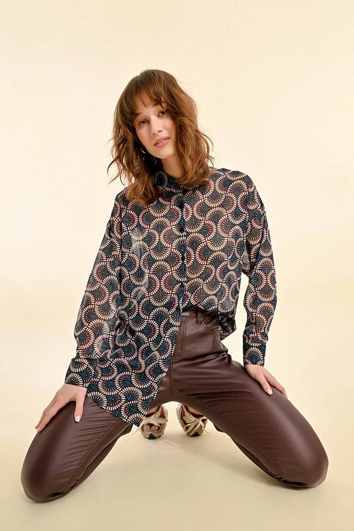 Chemise oversize en voile imprimé, Manches longues, Poignets boutonnés, Col chemisier, Fermeture par boutons sur le milieu devant, En transparence, Longueur depuis l'épaule 75 cm (pour une taille S)