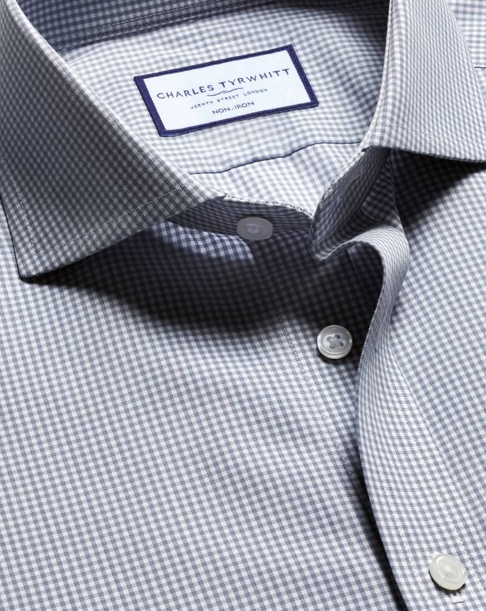 100% cotton, Available in classic, slim and extra slim fit, Non-iron, Spread collar, Classic and slim fit: back pleats, Extra slim fit: back darts, Mitred button cuff with two buttons, Machine washable - Cutaway Collar Non-Iron Poplin Mini Gingham Check Shirt - Light Grey | Men's Charles Tyrwhitt Cutaway Collar Non-Iron Poplin Mini Gingham Checkered Dress Shirt - Light Grey Single Cuff Size Small Cotton