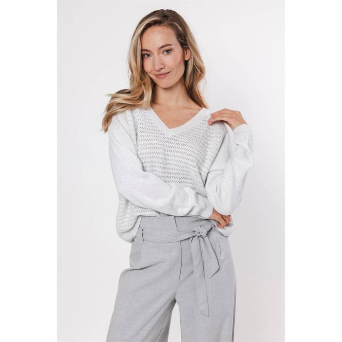 The yarn of this sweater is enriched with subtle sequins that provide a touch of shine to your daily wardrobe. The sweater has a V-neck and long raglan sleeves.