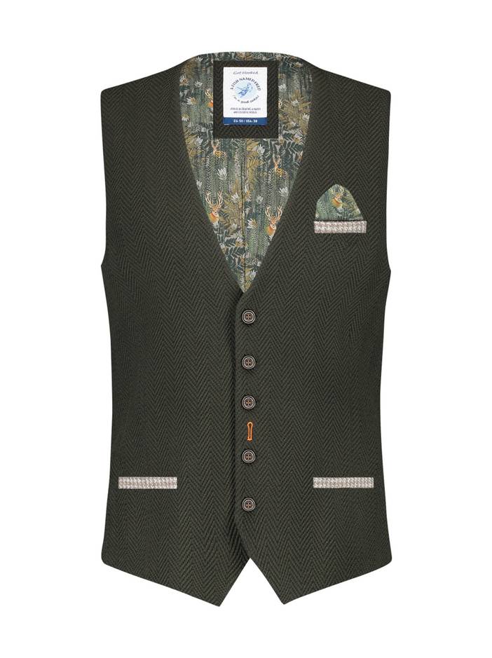 The Waistcoat Herringbone is crafted from a blend of 70% polyester, 28% viscose, and 2% elastane. This combination provides durability, a smooth feel, and a slight stretch for comfort. The herringbone pattern is a classic and subtle V-shaped weaving that is often used in fine tailoring for its sophisticated appearance. The addition of a printed inner lining in the waistcoat adds a discreet yet distinctive touch, enhancing the overall aesthetic and offering an elegant contrast when the waistcoat is viewed from the inside or when the outer layer is slightly opened.