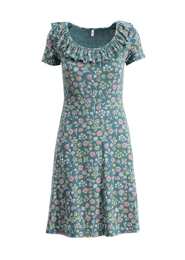 Entzückendes Kurzarm-Kleid aus einem weichen Baumwoll-Modal-Jersey. Der Rundhalsausschnitt des gemütlichen Kleides wurde vorderseitig mit zauberhaften Rüschen versehen und so in ein ausgefallenes Lieblingsstück verwandelt. Neben diesem hinreißenden Detail lassen sich an dem femininen Kleid außerdem kurze Raglanärmeln, ein breiter Taillenbund und ein Satin-Schleifchen samt filigranem Anhänger aus altgoldfarbenem Metall in Nähe der Bundansatznaht finden. Der Rockteil des Kleides zeigt sich leicht ausgestellt und ist mit seiner kniebedeckten Länge wunderbar alltagstauglich. Zusätzlich zu den vier starken, vom wilden Westen inspirierten Musterkreationen, haben wir eine heißgeliebte Stoffkreation aus dem Jahr 2013 nochmals aufleben lassen - Yee-haw!