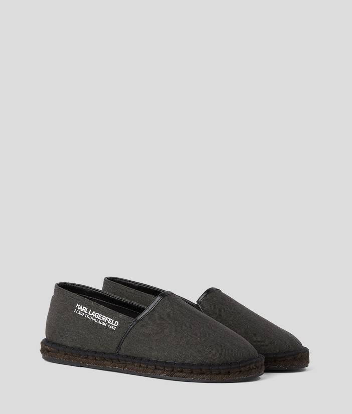 Distressed canvas meets sleek leather in these KARL LAGERFELD espadrilles, featuring a comfortable leather footbed and an effortlessly chic slip-on style, accented by the iconic KARL logo.