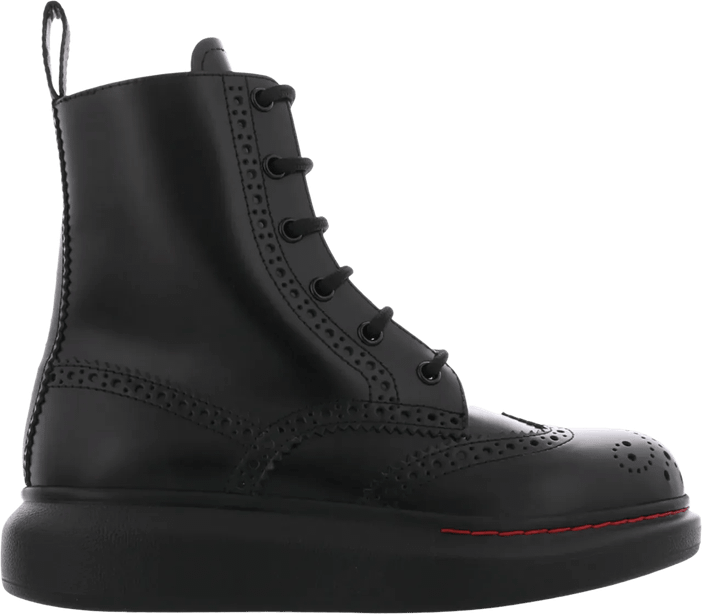 The Alexander McQueen Dames Hybrid New Liquid Boot Zwart is an exquisite example of high-end craftsmanship, merging traditional and modern aesthetics. This predominantly black boot features a sleek, polished finish with intricate brogue perforations for added elegance. The lace-up front accentuates its classic allure, while the oversized sole introduces contemporary flair. A subtle red accent line and convenient pull tab complete the design, creating a distinguished footwear accessory.