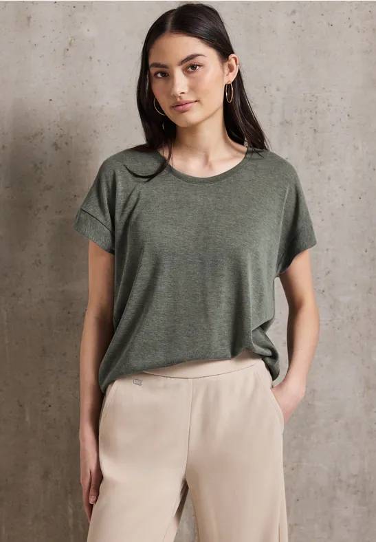 Die Leinen-Optik verleiht diesem Shirt von Street One Studio für Damen sommerliches Flair. Das T-Shirt hat einen Rundhalsausschnitt und kurze Ärmel. Der angenehme Materialmix sorgt für ein leichtes Tragegefühl.