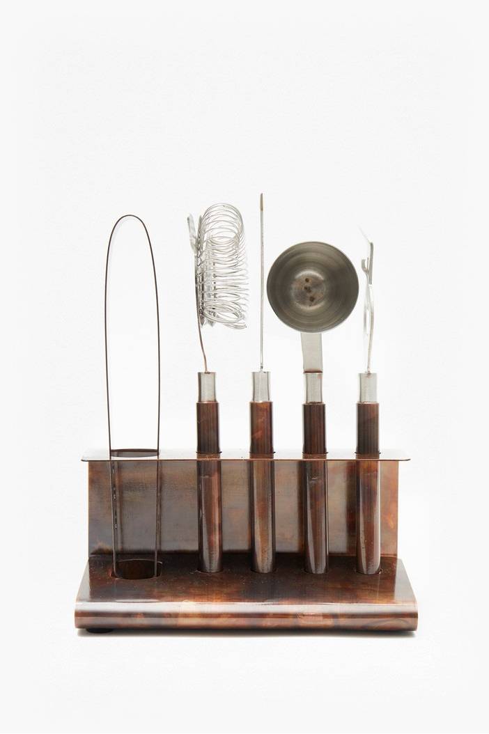 Make cocktail hour a celebratory occasion with the Galaxy 5 Piece Cocktail Set. Featuring a strainer, measuring jigger, two bar spoons and a set of tongues, the set will help you craft the perfect drinks. With an antiqued copper finish and elegant metallic design, the cocktail set brings form and function together in an elegant must-have bar essential. Cocktail tools Metallic antique finish One pair of tongues One shaker One measuring jigger Two bar spoons One stand Width : 7cm; Length : 15cm; Height : 20cm Style code - 80AO2