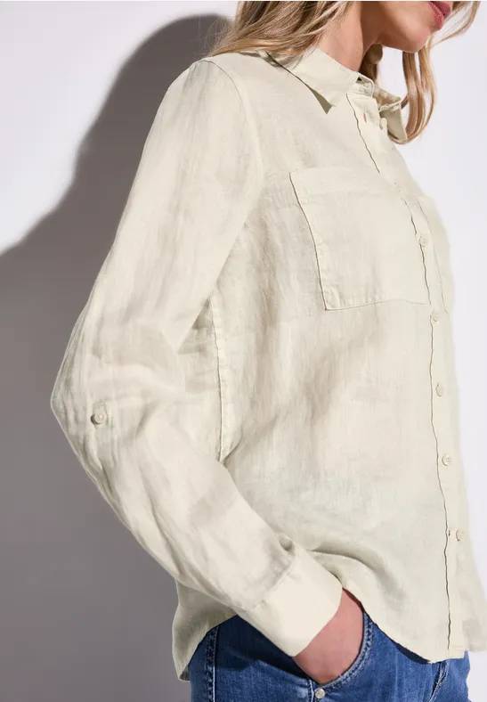 Die Leinen-Hemdbluse von Street One für Damen punktet mit luftigem Tragekomfort. Der Hemdkragen, die Brusttaschen und die Turn-Up-Ärmel sorgen für einen lässigen Look. Die leichte Leinenqualität macht sie perfekt für warme Tage.