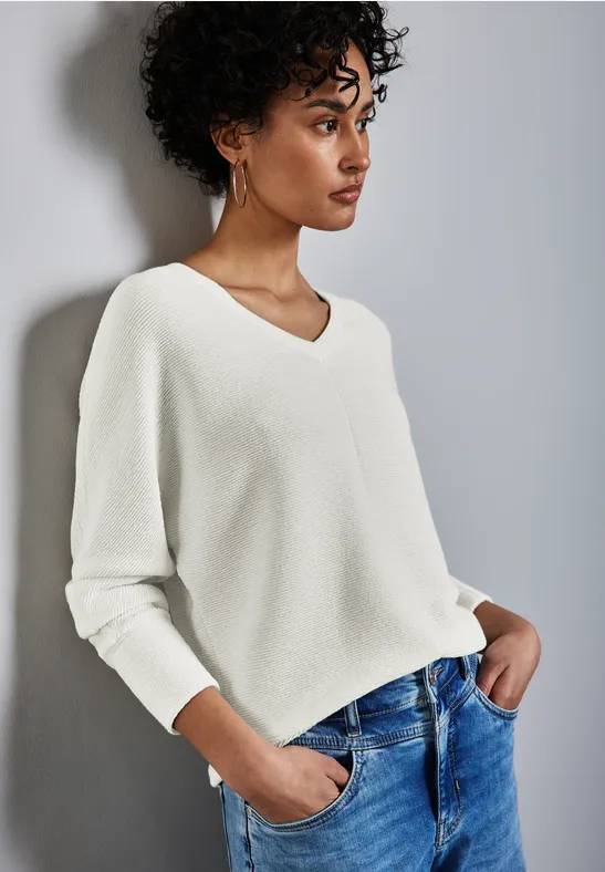 Ce t-shirt structuré de Street One pour femmes avec un col en V et des manches longues est un must-have pour les looks confortables. Le mélange de matières avec une part de stretch assure un confort agréable et fait de ce t-shirt un compagnon particulièrement douillet pour tes tenues.