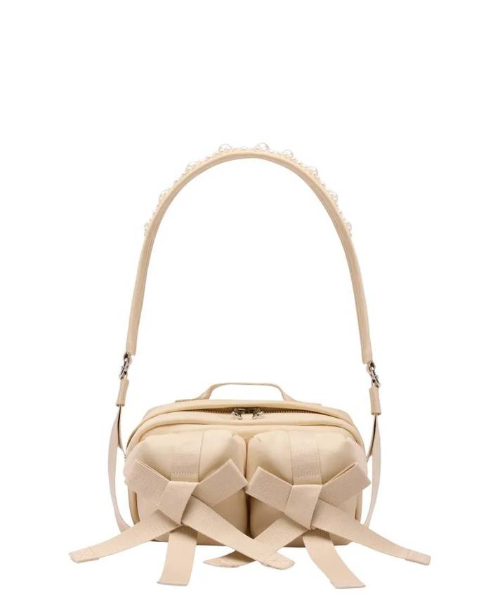 A stunning crossbody bag from Simone Rocha showcases timeless elegance. Exquisite design includes two front pockets for practicality and a top zip closure for secure storage. The shoulder strap, adorned with luxurious pearls, enhances its charm, while the top handle offers versatility. Decorative bows at the base complete this accessory, making it a symbol of sophistication for any occasion.- Two front pockets- Top zip closure- Pearl-adorned shoulder strap- Versatile top handle- Decorative bows at the base