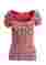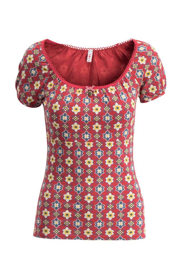 Verspieltes Kurzarm-Shirt aus einem anschmiegsamen Wohlfühl-Jersey in vier Ho-la-re-di-ri- jodelnden Allover-Artworks! Das körpernah geschnittene T-Shirt hat den entzückenden Charakter einer Folklorebluse und darf als musterstarkes Kombinationstalent in keiner Garderobe fehlen! Kurze Raglan-Ärmel, eine passformoptimierende und Silhouetten-umgarnende Teilungsnaht unter der Brust sowie der klassisch-unkomplizierte Rundhalsausschnitt versprechen Wohlfühlmomente und tollen Tragekomfort mit Alltagstauglichkeit. Die feine Einfassung aus kontrastierendem Jersey wurde entlang des Ausschnitts mit einer farblich korrespondierenden Häkelbogenkante garniert; on top wurde ein Vichy-gemustertes Schleifchen samt retroverliebter Miniatur-Kuhglocke aus bronzefarbenem Metall auf der vorderseitigen Ausschnittmitte platziert. Wer genau hinsieht, entdeckt hierbei die Symbole unserer Marke…