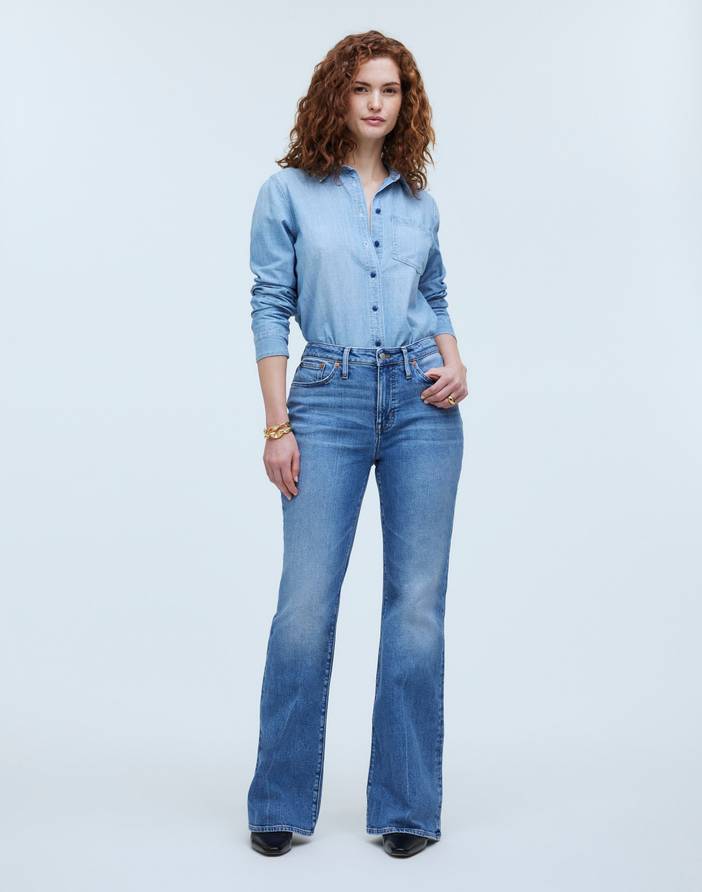 The cut: An icon since its 2014 debut, the '70s-inspired Flea Market Flare is an instant leg-lengthener. Engineered for those with an hourglass shape, it has a narrower waist with a contoured band, a longer rise (for a rounder booty) and a little extra room at the hips and thighs. With an old-school flare and deep creases down each leg, this curvy pair is complete with our holds-you-in Magic Pockets™ in front.The fabric: premium Orta denim that combines the holds-you-in structure of rigid with a touch of stretch for day-one comfort.Light wash with authentic fading and distressing.10 1/2" rise, 21 1/2" leg opening, 35" inseam.96% cotton (6% of which is recycled)/3% elastomultiester (EME)/1% elastane.Machine wash.Imported.Madewell.com only.