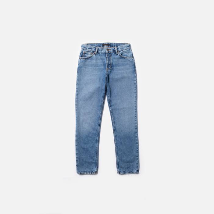 Low-waist regular-fit jeans with a straight leg in a vintage-like mid-blue wash. This wash presents an impressive spectrum of indigo hues, ranging from bright to dark blue, adding depth and character. The texture of the denim is equally remarkable, showcasing defined twill lines and rich marble effects. The harmonious balance of these elements creates an overall aesthetic that is truly superb.