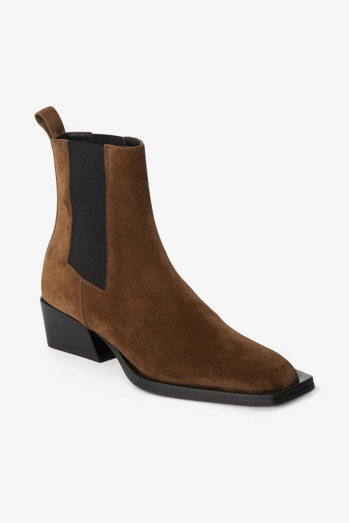 The Dagmar take on the chelsea ankle boot presents a distinct square toe and an angled heel. Hand made in Italy in, the Suede Leather Boots feature a 5,5 cm stacked wooden heel with a rubber top lift, rubber pieces on the sole, a pull tab in the back and elastic panels on the sides.