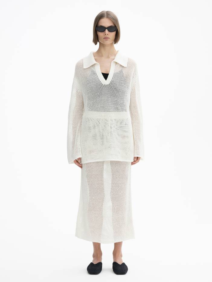 Imagined in softly structured linen, the Crochet Knit presents a dynamic interplay of material and texture. Pared-back, this spring and summer staple features a bold yet breezy crochet knit stitch. Designed for a relaxed, elongated fit and framed by a wide polo neck collar.