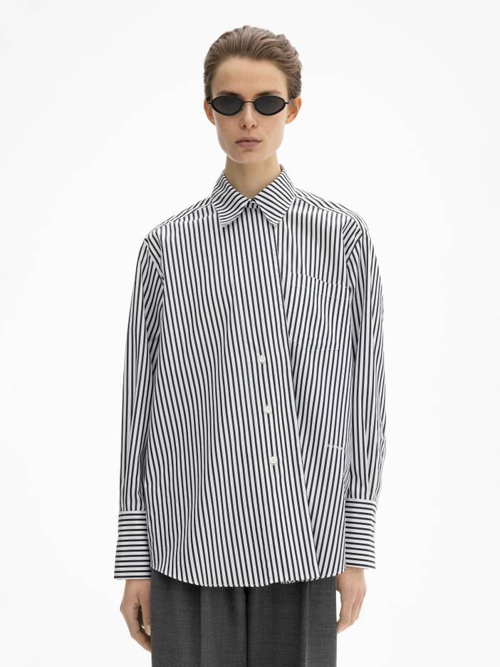 Button-up shirt in crisp organic cotton poplin with a relaxed fit, asymmetric fold-over collar, and three-buttoned cuffs honoring Dagmar’s three founding sisters. Signature logo on the side.