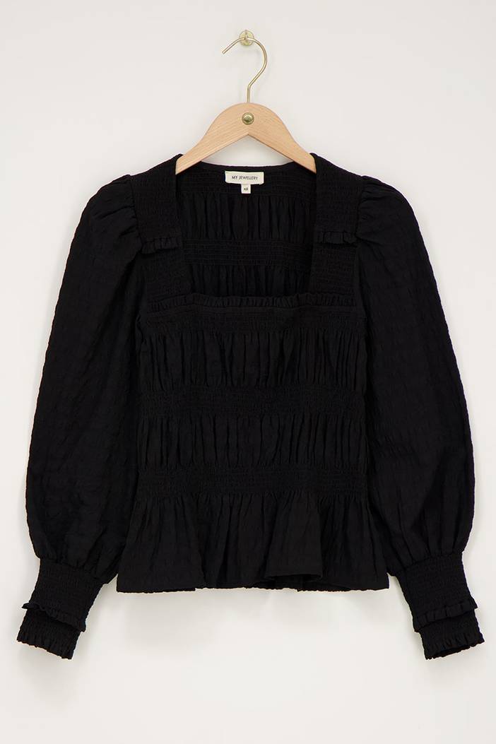 Deze top zal je nooit vervelen! Deze top (https://www.my-jewellery.com/nl-nl/kleding/tops-t-shirts/topjes.html) heeft lange mouwen, (https://www.my-jewellery.com/nl-nl/kleding/tops-t-shirts/tops-met-lange-mouwen.html) smock en ruffles, waardoor deze top helemaal on-trend is. De top heeft een zwarte kleur, dus combineren is nog nooit zo makkelijk geweest. Combineer de top met jouw favoriete jeans (https://www.my-jewellery.com/nl-nl/kleding/broeken/jeans.html) en wees ready for the day!