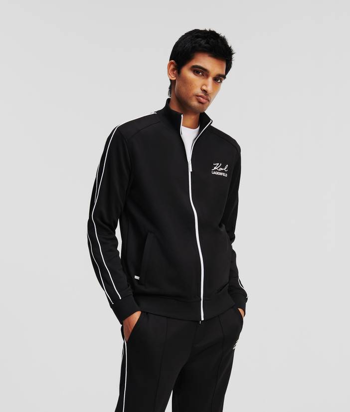 Embrace casual elegance with a KARL logo-adorned zip-up sweatshirt, boasting a stand-up collar and contrasting shoulder trims, in a comfortable regular fit.