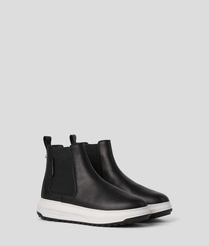 Step out in style and comfort. Crafted from luxurious leather, these chunky boots by KARL LAGERFELD offer modern twist on a classic slip-on design.