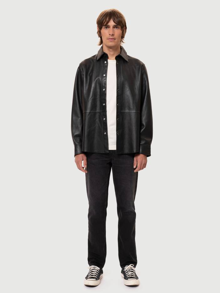 Smart and easygoing shirt made in supple sheepskin leather. It's light, and the leather is smooth and supple with great luster. The body is unlined, but sleeves have a black lining made with recycled polyester for your comfort. You close the shirt with black prong snaps.