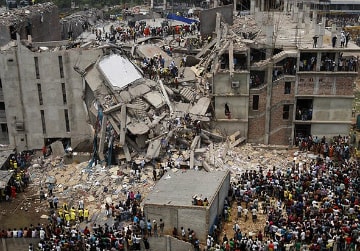 Images (top to bottom): Workers at TEB, a responsible factory in Bangladesh / Dinana; the collapsed Rana Plaza building / rijans; the canteen at TEB, offering three warm meals a day / Dinana